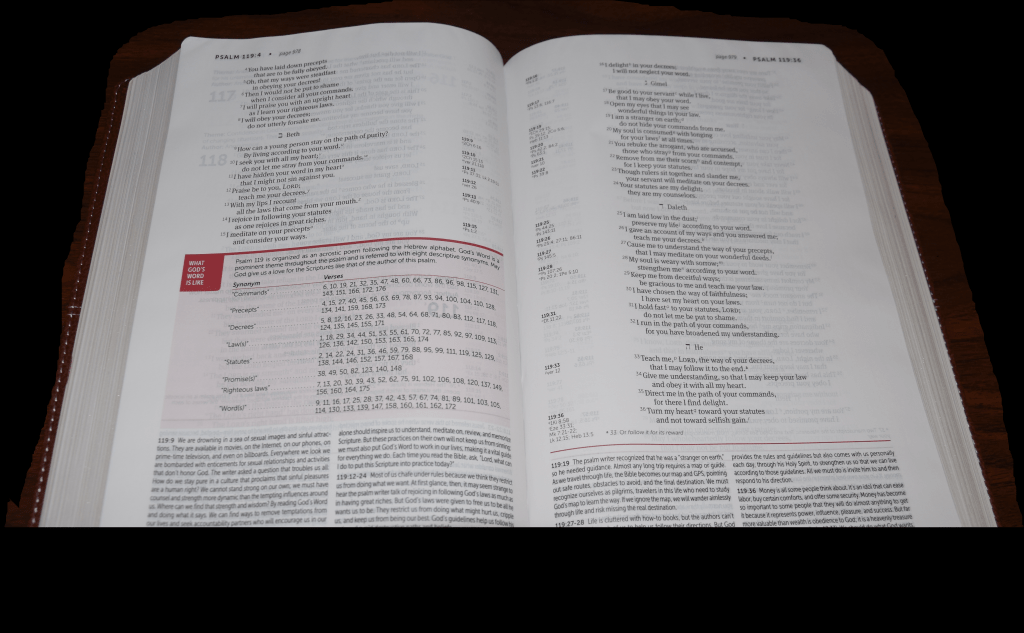 For example, I really like the NIV LASB feature in the Psalms, where it provides the theme and author for each psalm. I like this feature a lot because I started a similar thing in my own Bible reading (have not finished yet), where I tried to understand each psalm and summarize its main point. Although I really like this feature, I don’t think it is helpful in the long run. If the theme is already provided for me, then I would be tempted not to try to come up with a theme statement on my own. The process of discovery, learning, and understanding the biblical text is short-circuited.